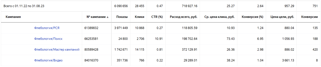 К моменту запуска мастера кампаний нами у клиента уже были настроены кампании на поиске и в РСЯ. Чтобы нарастить трафик по флебологии было принято решение протестировать мастер кампаний. Для нас запуск рекламы с помощью мастера кампаний был впервые.