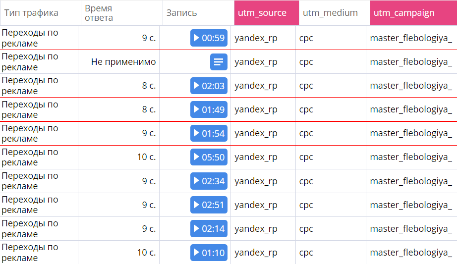 В Callibri для подсчета звонков с нужной нам рекламной кампании в Яндекс Директ используем колонки utm_source и utm_campaign. Считаем только звонки, совершенные впервые. Так, мы определяем, что источником трафика была та или иная рекламная кампания, и сколько звонков по ней поступило. На скриншоте приведен пример сортировки звонков из мастера кампаний по флебологии:
